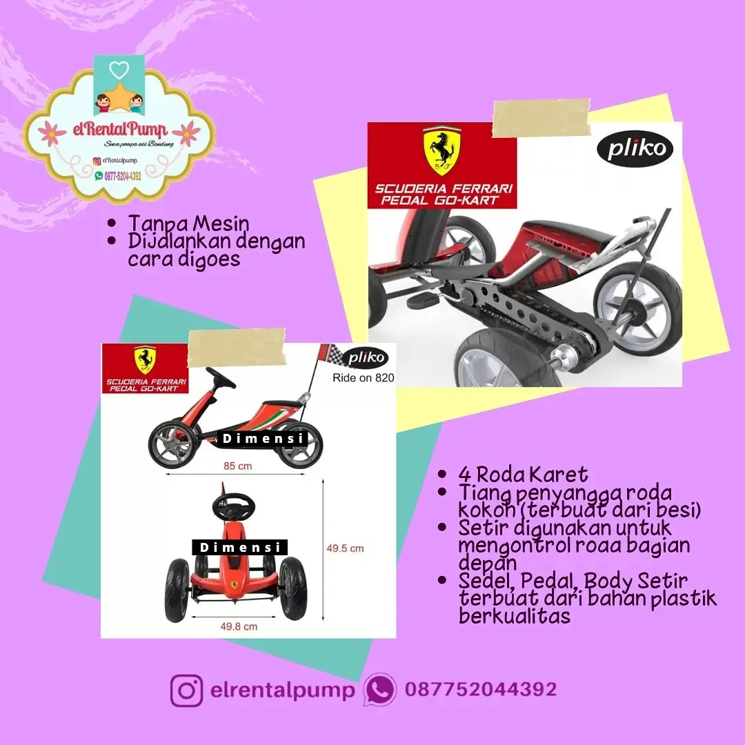 Go Kart tanpa mesin, dilengkapi pedal seperti sepeda. Terdiri dari 4 roda sehingga lebih stabil memudahkan anak untuk belajar mengoes / mengayuh pedal, menyalurkan energi si kecil yang aktif dan mengembangkan motorik anak.