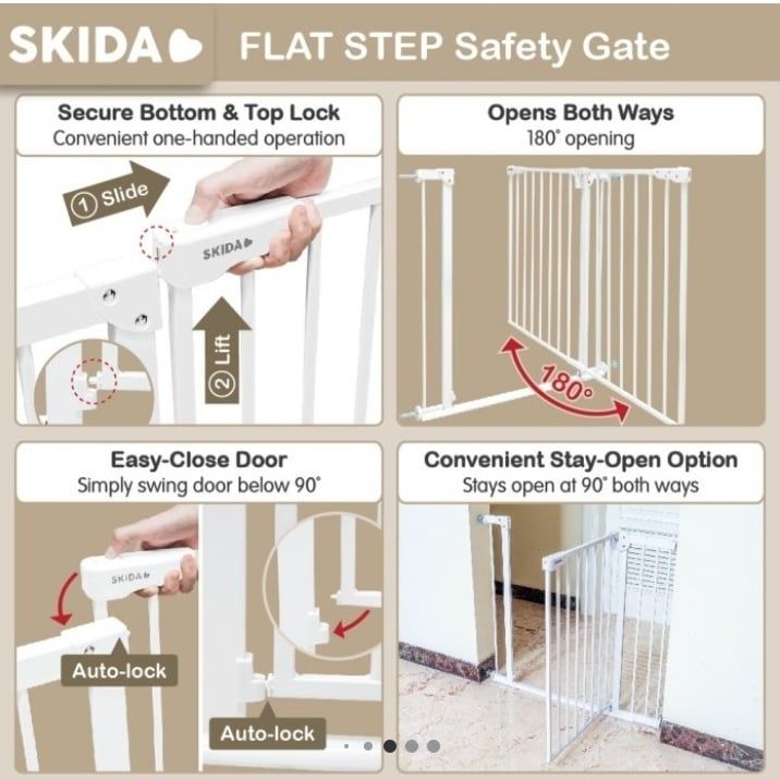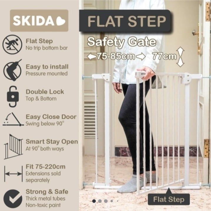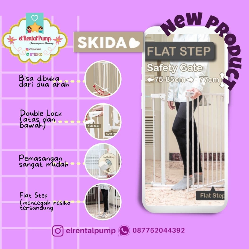 Pagar pengaman SKIDA tipe FLAT STEP Safety Gate ini merupakan inovasi terbaru dengan tiang bawah pagar yang sangat gepeng (hanya 1.5cm!) yang dapat mengurangi resiko tersandung ketika berjalan melewati pagar. Fitur ini juga memberikan kemudahan agar stroller / sepeda / roda dapat melewati pagar dengan mudah. Tidak perlu lagi beli aksesoris Step Pass terpisah, lebih hemat dan nyaman.