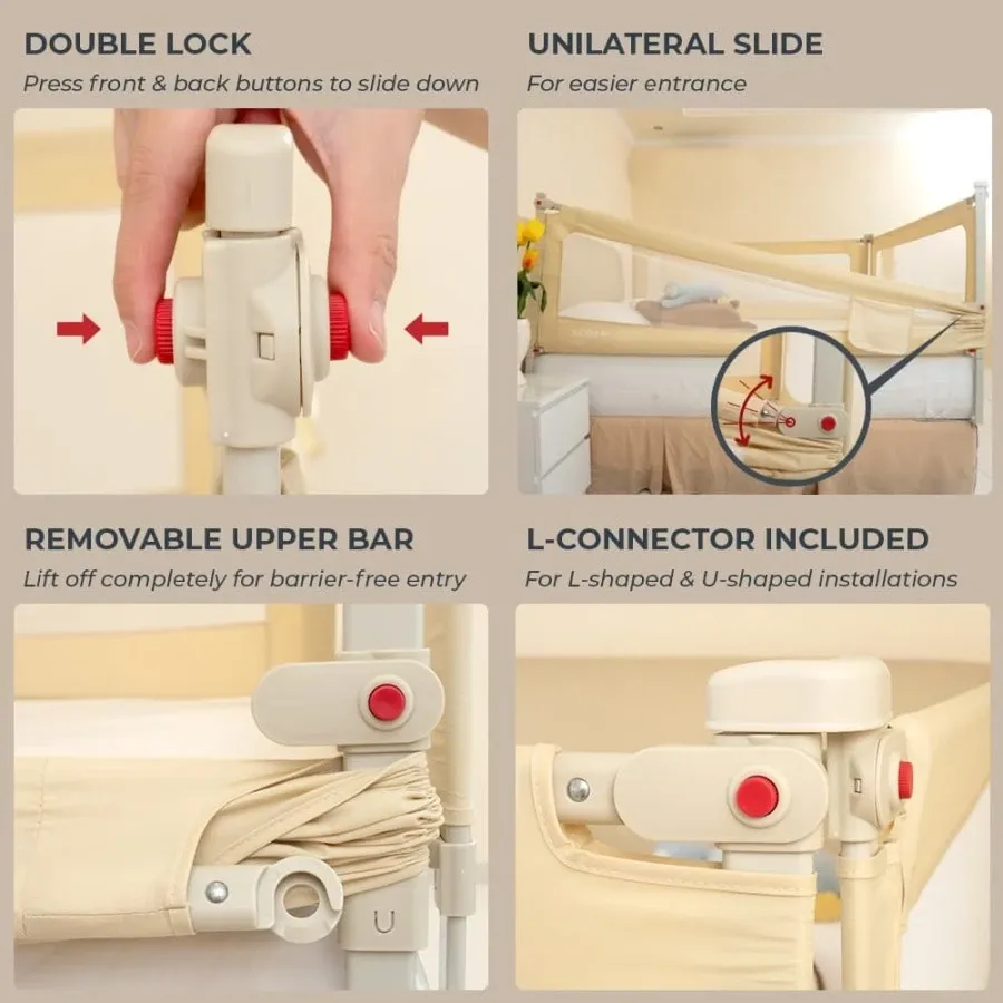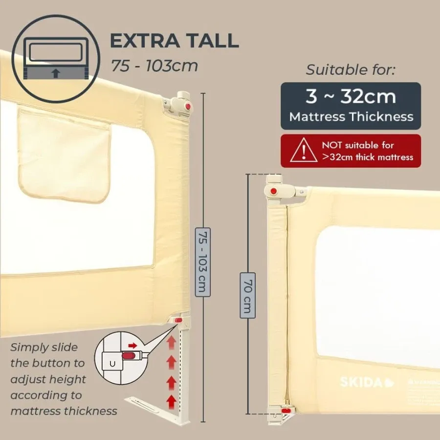 Skida Extra Tall Slide Down Bedrail merupakan pagar pengaman yang dipasang pada tempat tidur untuk menjaga agar anak tidak terjatuh dari tempat tidur. Tinggi bedrail dapat diatur dengan mudah dari 75cm sampai 103cm (extra tall), sesuai dengan ketebalan matras (tebal matras maximum 32cm). Bedrail Skida dilengkapi dengan 'flat bottom bar' yang mengarah ke sisi kasur untuk menghindari bayi dari terjebak di antara kasur dan bedrail (prevents entrapment). KEUNGGULAN: